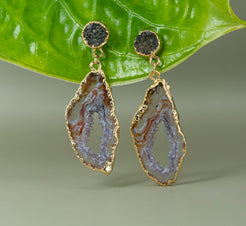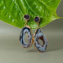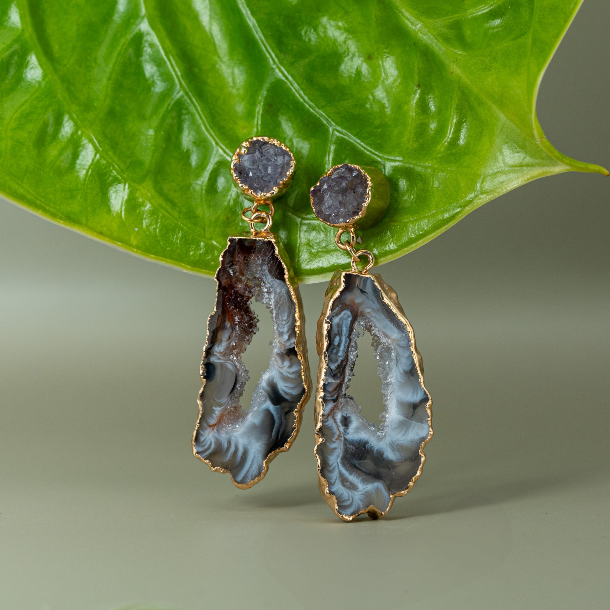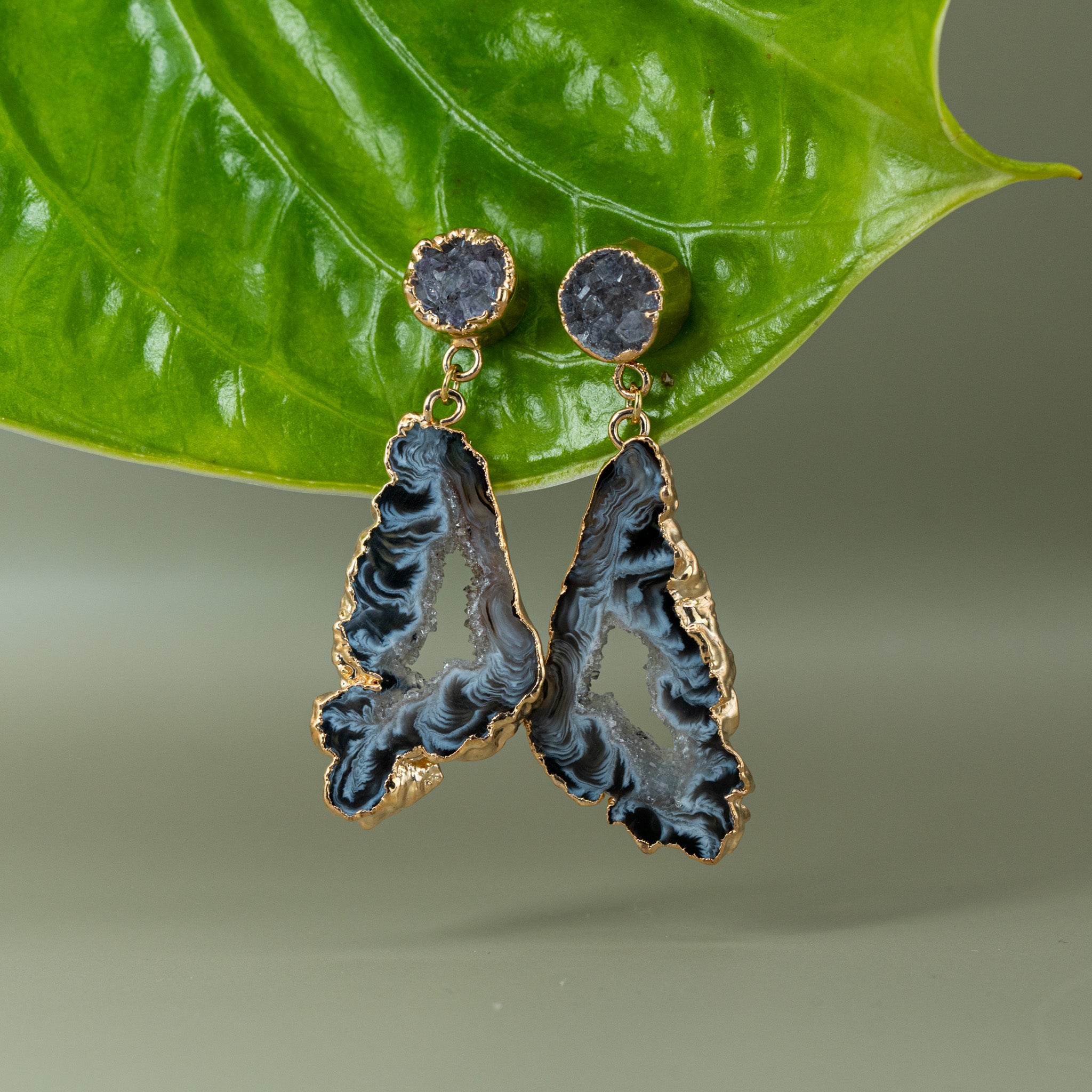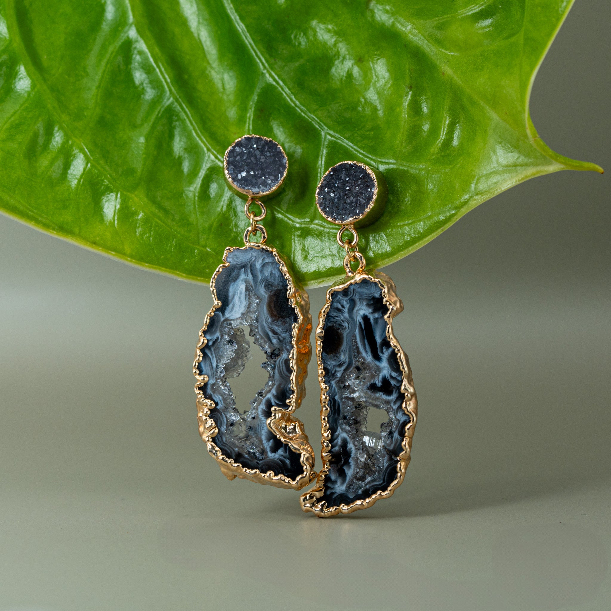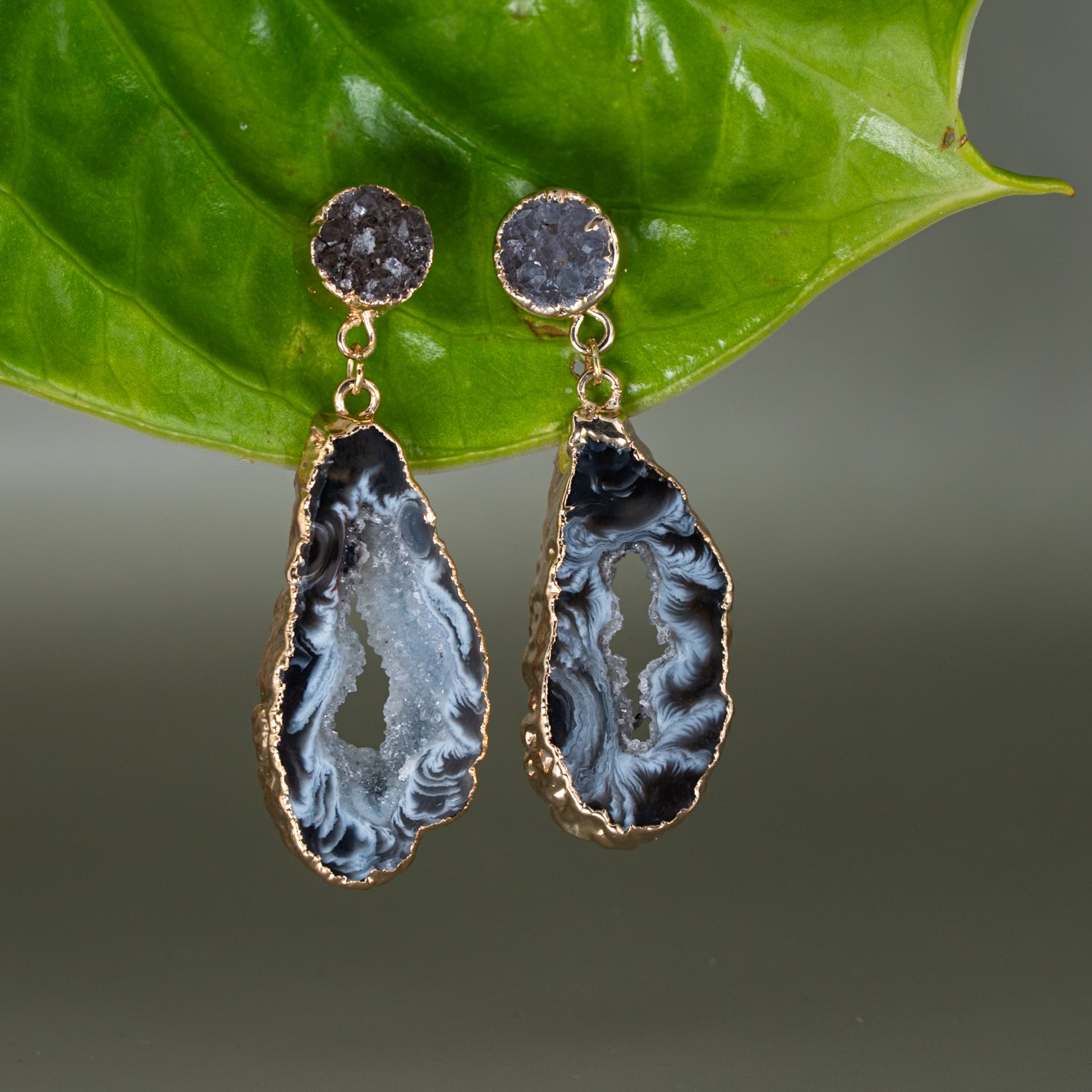 Agate & Druzy - Ohrstecker – Dunkel, 18K vergoldete Fassung, Nickel Frei