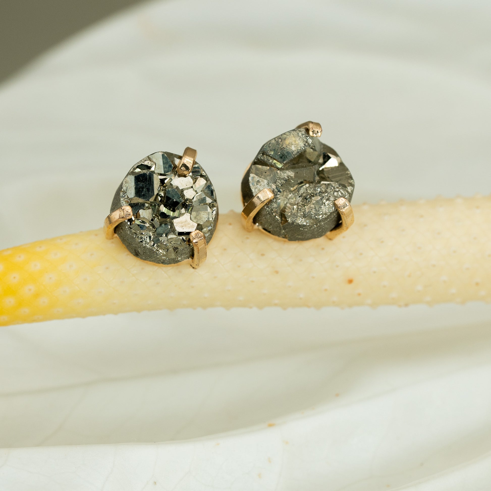 Striking. Elegant. Unique. These hand-picked pyrite ear studs in round shape combine the special radiance of pyrite w...