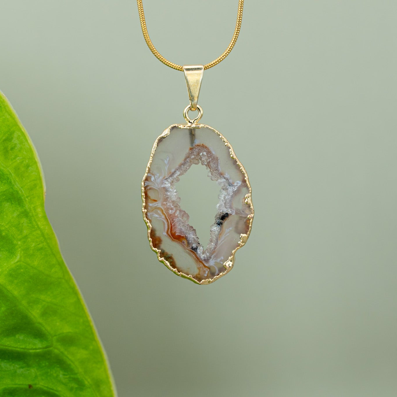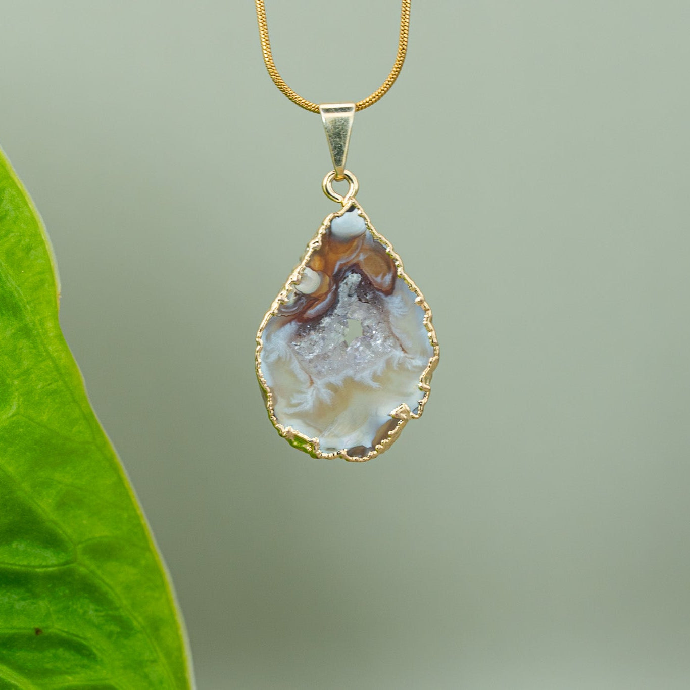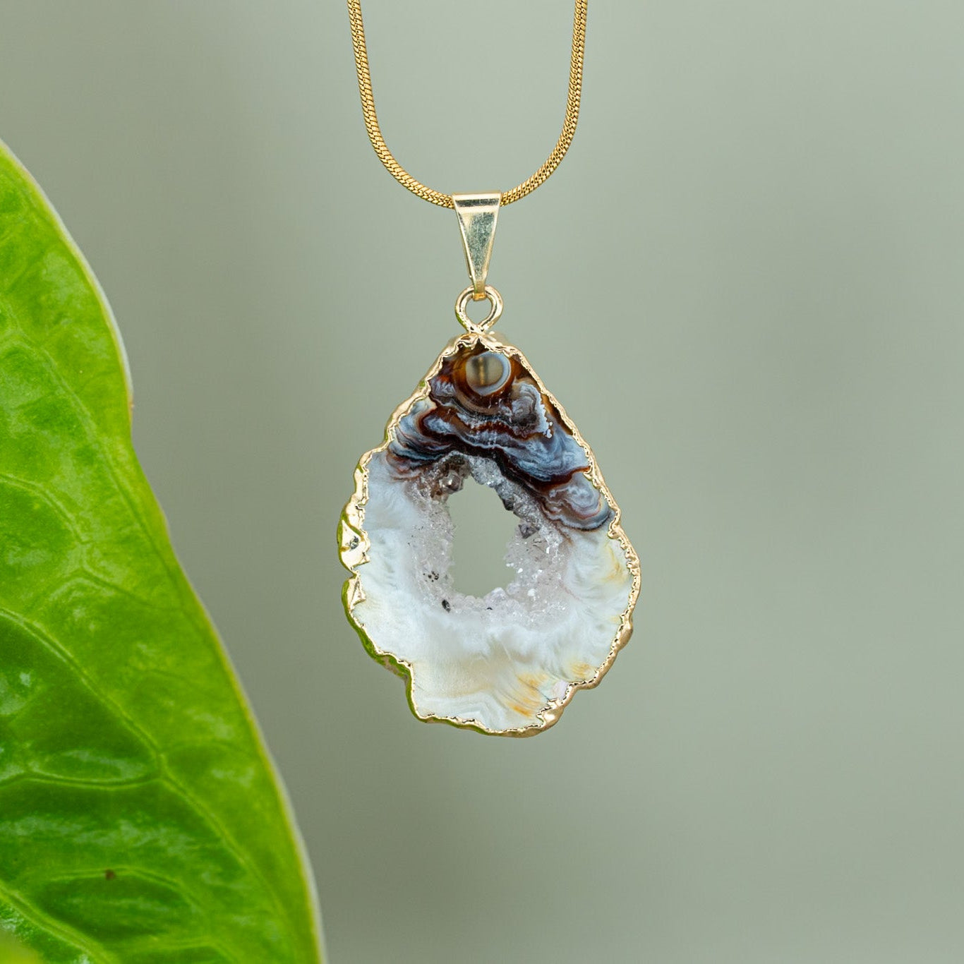 Ein handverlesenes Agate Amulett, 18K vergoldet, kombiniert mit einer hochwertigen, vergoldeten Edelstahlkette (verstellbar bis 45 cm). Wähle dein Lieblingsstück – du erhältst genau das, was du siehst.