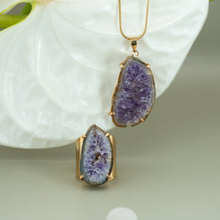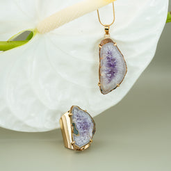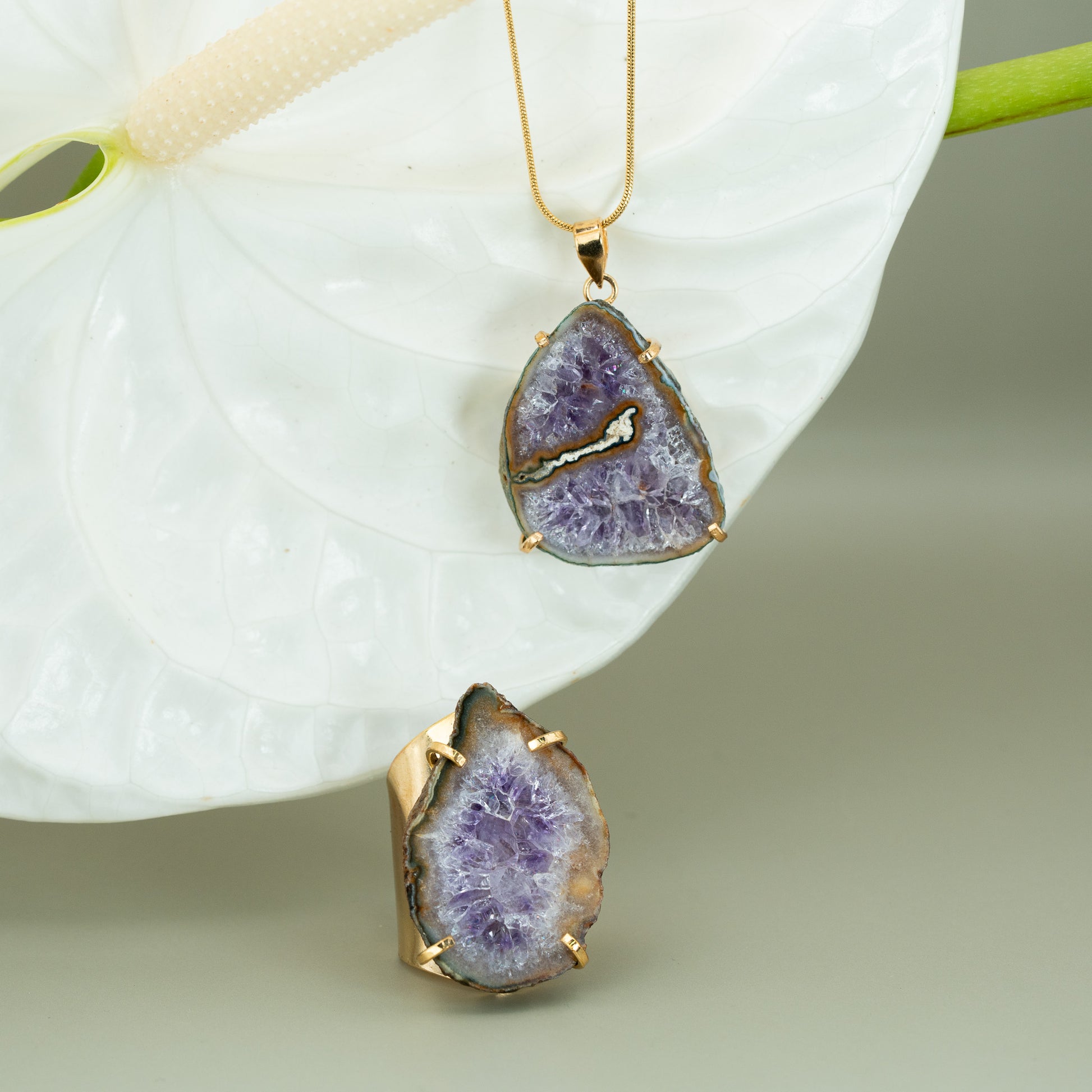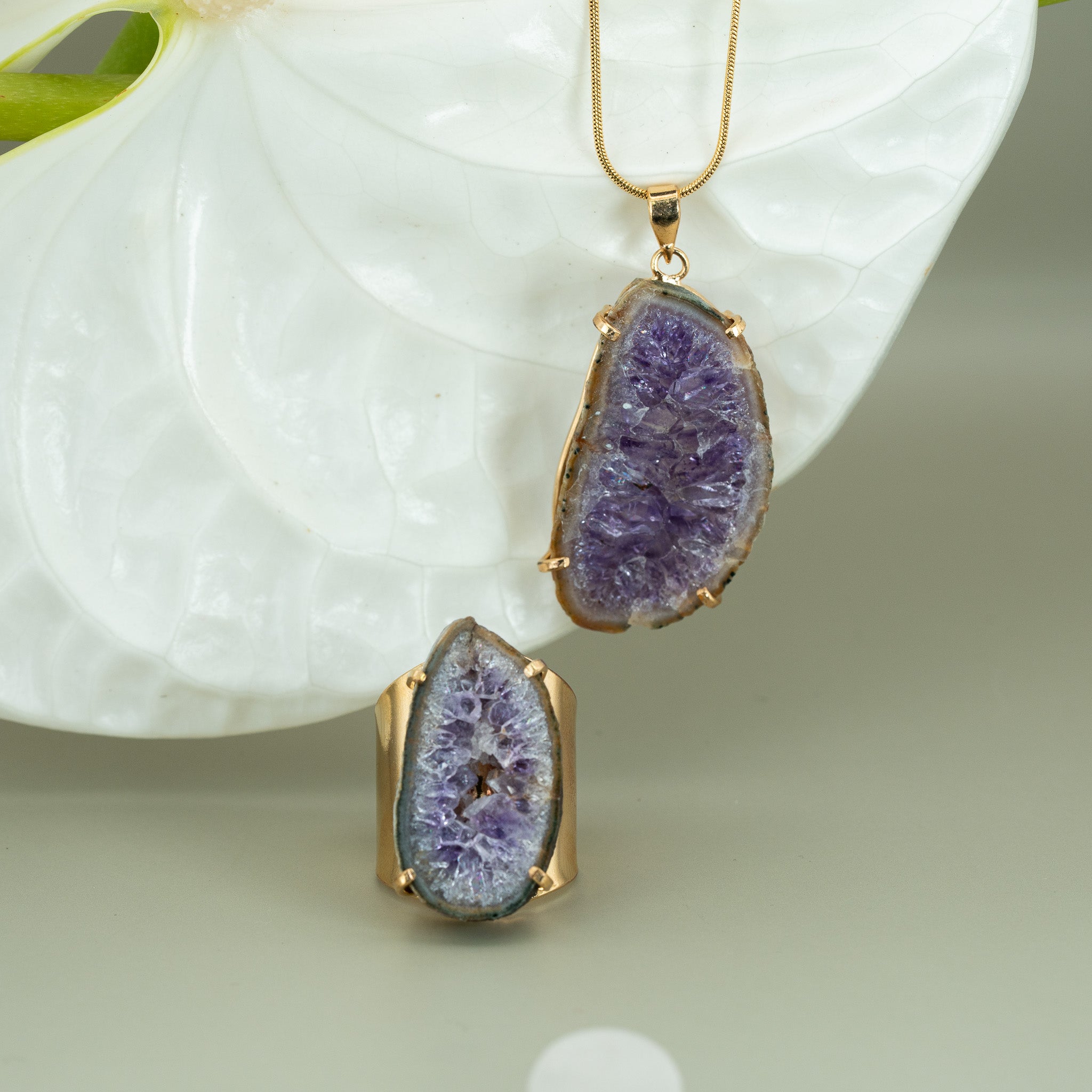 Amethyst-Set mit einem stilvollen Amulett und einem passenden Ring. Perfekt für alle, die natürlichen Glanz und zeitlose Eleganz schätzen.