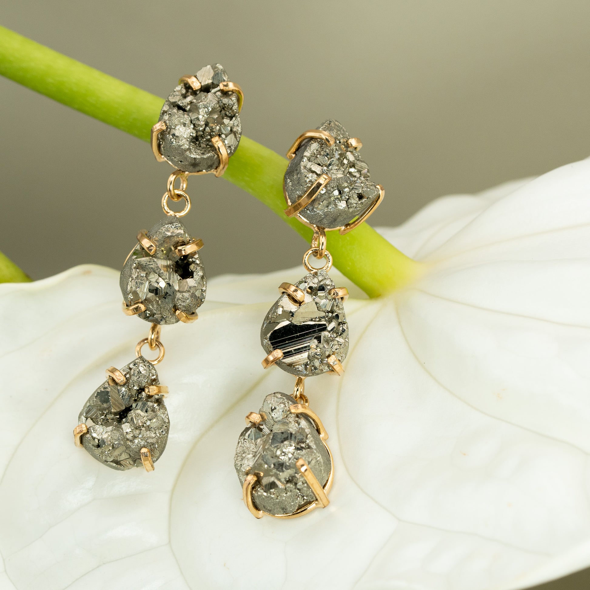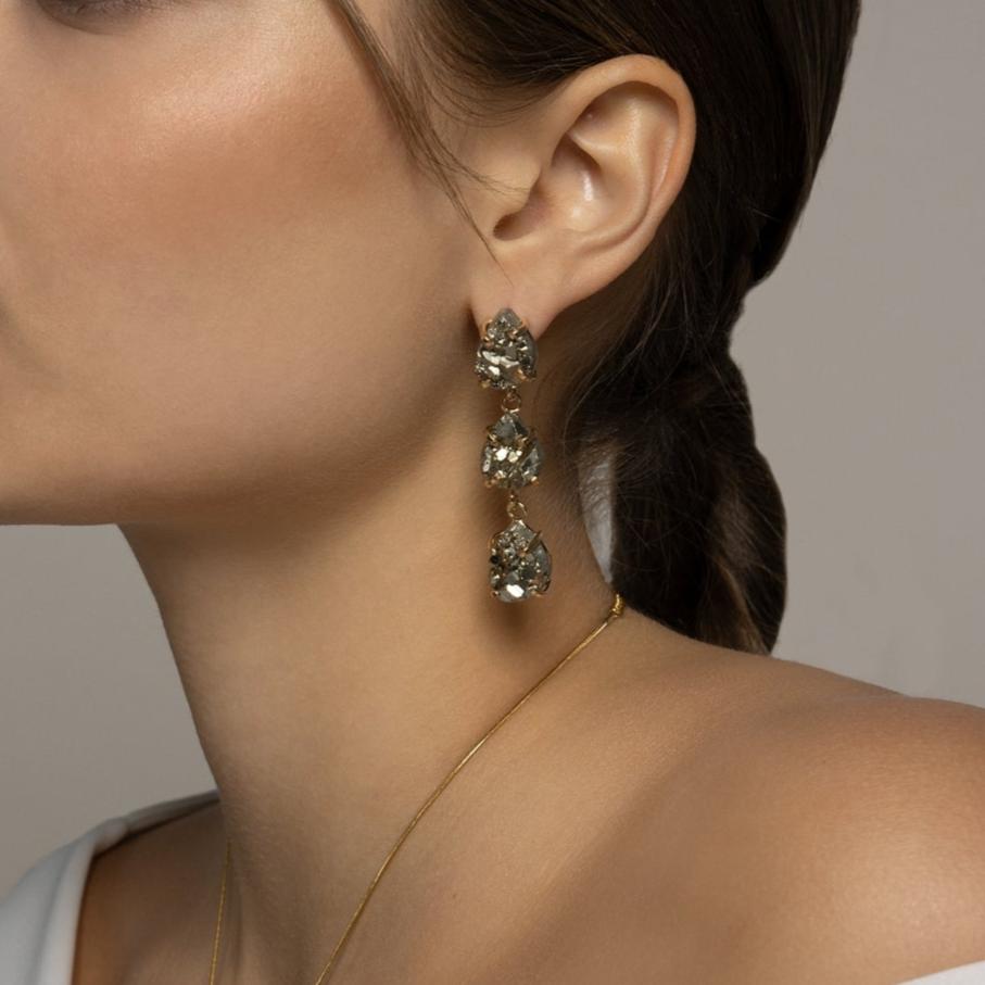 Pyrit Ohrringe Dreifach Tropfen – 18K vergoldete Fassung, nickelfrei