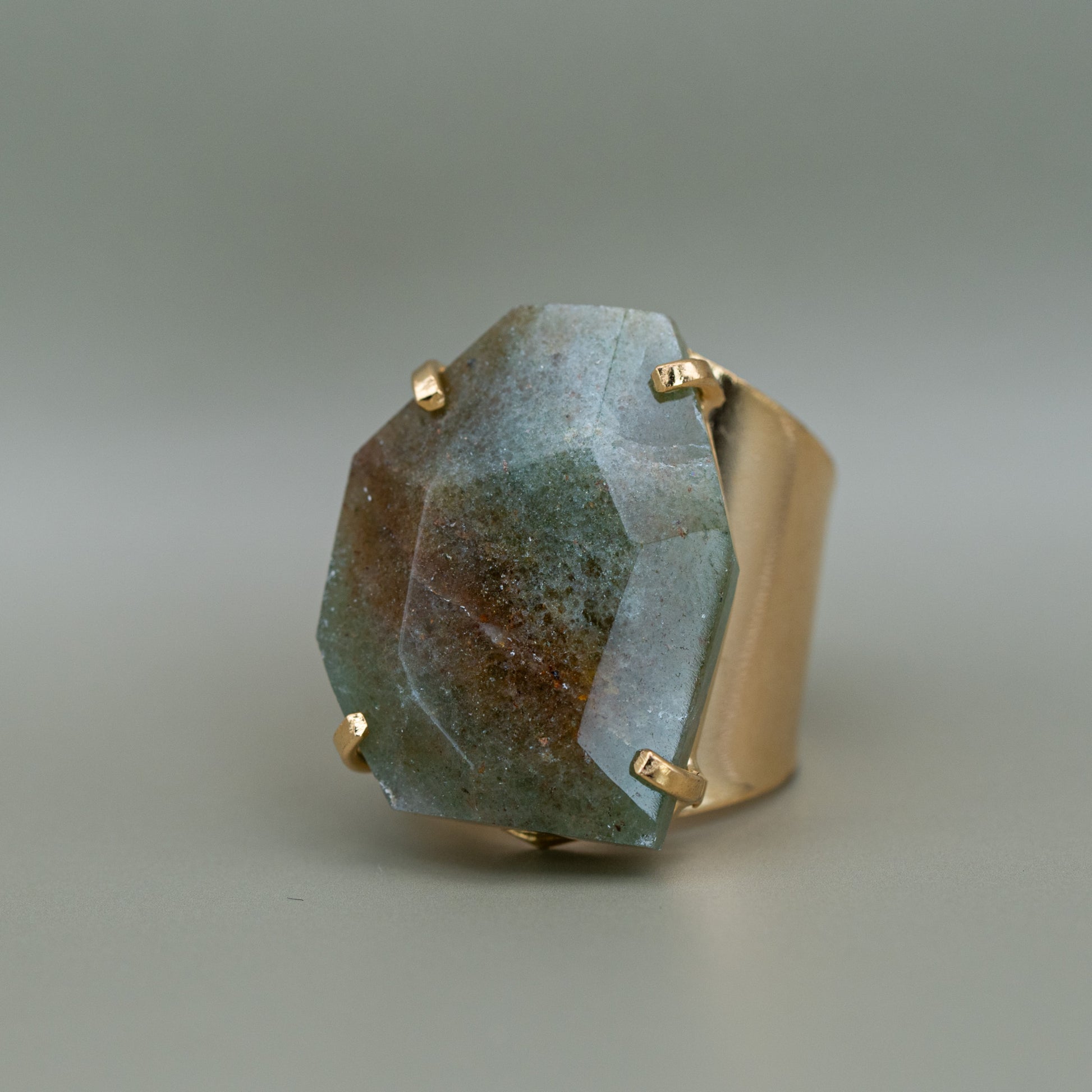 Dieser handverlesene Ring mit geschliffenem grünem Quarz vereint natürliche Schönheit mit edlem Design.Die offene Rin...